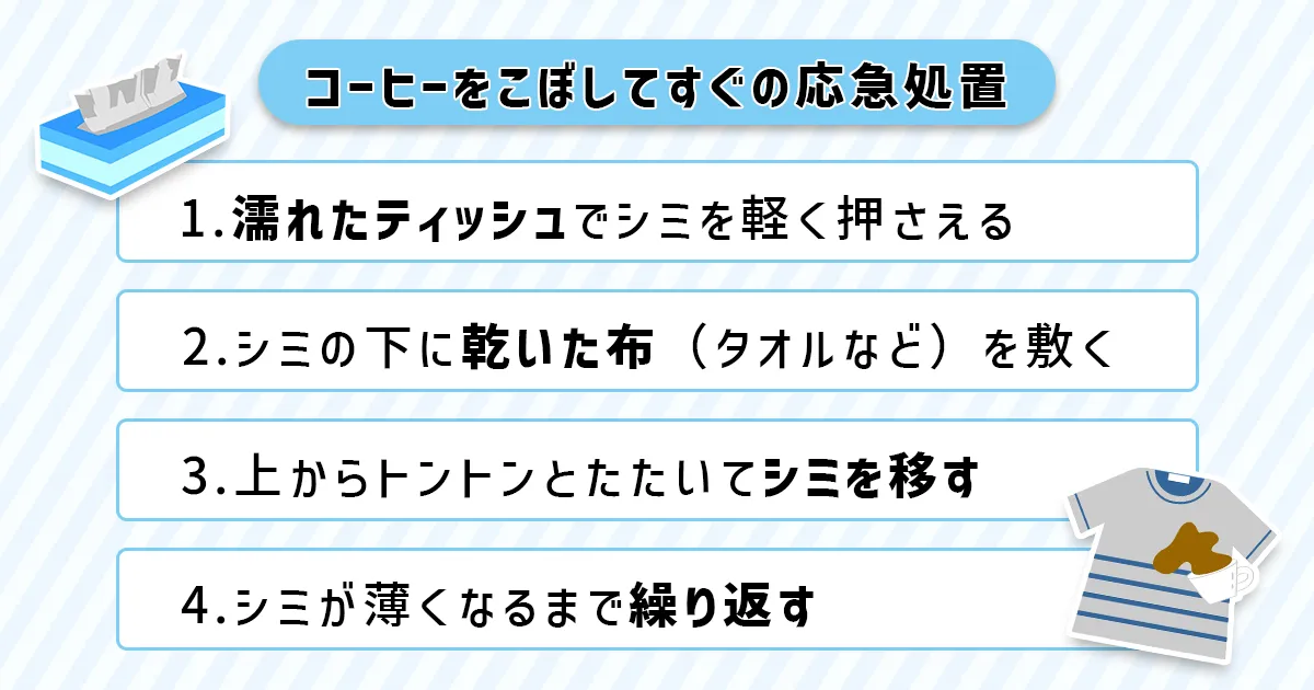 コーヒーのシミは放置すると取れにくくなりますが、適切な方法を使えば時間が経ったシミでも綺麗に落とすことができます。