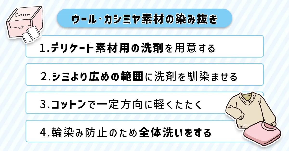 家庭での染み抜き方法として歯ブラシを使うものが多く紹介されていますが、ウールやカシミヤ素材の場合は、毛羽立ちや色抜けの原因となるため避けましょう。